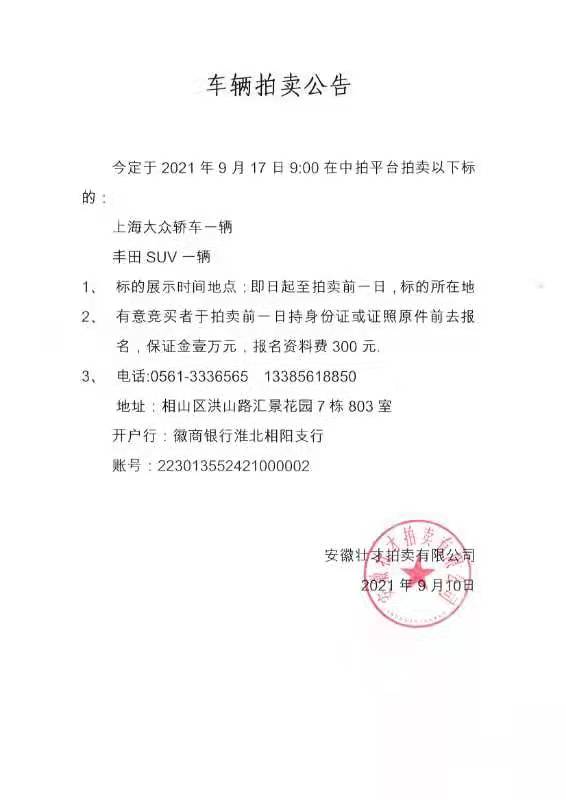 車輛拍賣公告 2021-09-10 11:29 上一篇:淮北市杜集區(qū)(高新區(qū)北區(qū))科創(chuàng)園(一期電子信息產(chǎn)業(yè)園)49號地塊基礎設施建設項目規(guī)劃方案編制項目招標公告(邀請招標) 下一篇:楊河北路路燈供電項目招標公告 返回列表